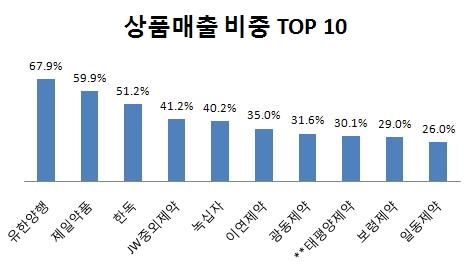 특히 유한양행은 이 기간 상품매출 비중이 치솟아 무려 70%에 육박하며 업계 최고를 기록했다.