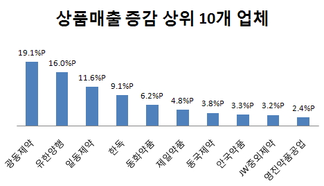 이어 일동제약(대표 이정치)이 11.6%P, 한독(대표 김영진) 9.1%P, 동화약품(대표 이숭래) 6.2%P, 제일약품(대표 성석제) 4.8%P, 동국제약(대표 이영욱) 3.8%P, 안국약품(대표 어진) 3.3%P, JW중외제약(대표 이경하) 3.2%P, 영진약품공업(대표 류병환) 2.4%P 상승해 톱 10에 들었다.