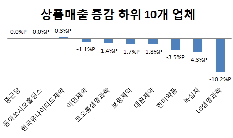 이 때문에 LG생명과학의 자사 제품 판매를 의미하는 제품판매 비중은 지난 2011년 74%에서 올해 3분기 82.3%로 8.2%나 상승했다. 이어 녹십자(대표 조순태)가 4.3%P, 한미약품(대표 이관순) 3.5%P, 대원제약(대표 백승열)과 보령제약(대표 김은선), 코오롱생명과학(대표 이우석), 이연제약(대표 유성락)은 2%P 미만으로 하락했다. 상품매출 비중 자체가 가장 높은 회사는 유한양행에 이었으며 이어 제일약품이 59.9%를 기록했다 제일약품은 고지혈증치료제인 ‘리피토’ 등 주로 한국화이자 상품의 대행판매를 하고 있다.