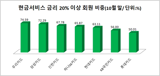 지난 10월 말 현재 20% 이상 고금리 적용대상자 비중을 카드사별로 보면, 우리카드(74.59%)와 삼성카드(72.29%)가 70%를 넘고, 신한카드(67.78%), 하나SK카드(65.87%), 현대카드(63.11%)도 60%대에 이른다. 상대적으로 비중이 낮은 KB국민카드(56.0%)와 롯데카드(50.01%)도 20% 이상 고금리 비중이 절반을 넘겼다.
