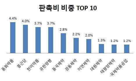 매출 대비 판촉비 비중이 가장 높은 제약사는 동화약품으로 4.4%였으며, 종근당이 4%, 한미약품과 유한양행이 3.7%, 동국제약이 2.8%로 5위권 안에 랭크됐다.