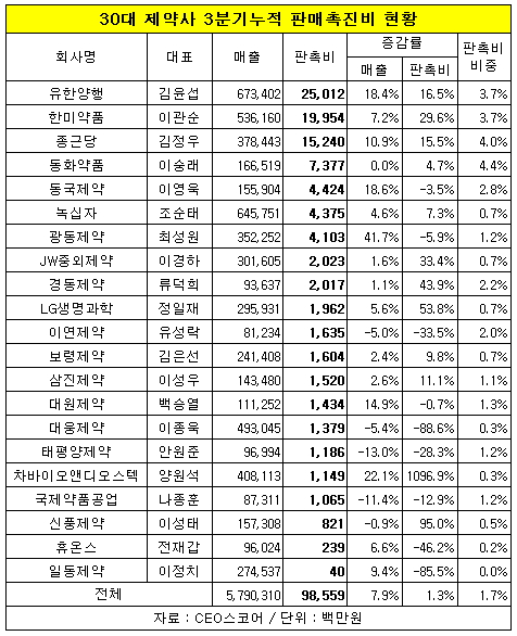 업계 1위인 유한양행의 경우 올해 3분기누적 매출 6천734억 원 중 250억 원을 판촉비로 지출해 30대 제약사 가운데 가장 많은 판촉비를 지출했다. 베링거인겔하임의 고혈압치료제 '트윈스타' 등 최근 도입한 해외 제품의 조기 정착을 위해 판촉활동을 활발히 벌인 결과로 분석된다.