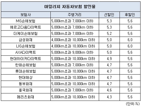 선할인율이 가장 높은 MG손해보험은 ‘5,000km 초과 7,000km 이하’ 주행 시 5.3% 할인해준다. 에르고다음다이렉트손해보험 역시 MG손보과 할인율은 같으나, 지난해 10월 AXA그룹에 인수되면서 올 1월부터 자동차보험 상품에 대한 신규 및 갱신 가입을 중단한 상태다.