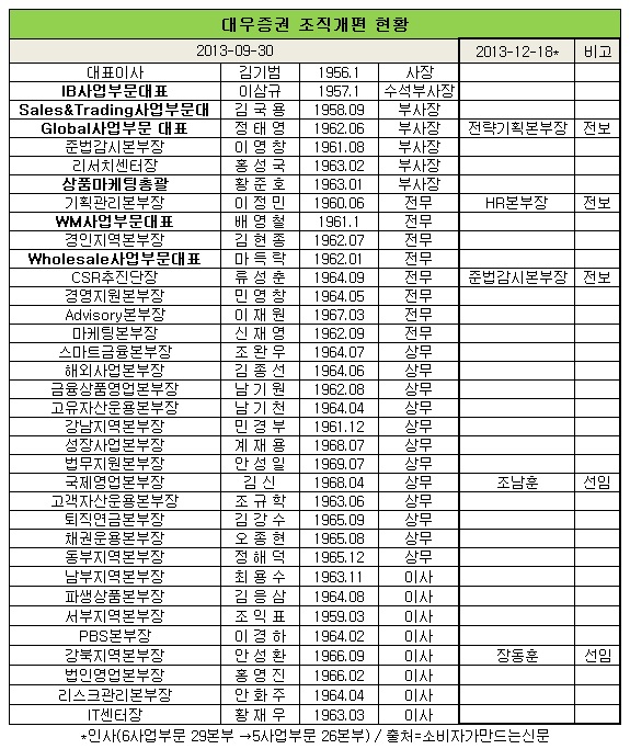 KDB대우증권 관계자는 “전략적 기능 강화와 속도경영은 물론 조직효율성 확대를 위해 조직개편을 단행했다”며 “조직의 내실화를 다지는 한편, 시장변화에 능동적으로 대응하기 위한 선제적 조치”라고 설명했다.