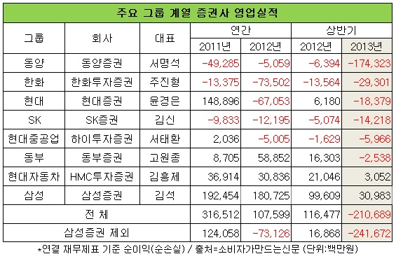 8개 그룹의 계열 증권사 가운데 순이익이 흑자를 기록한 곳은 올 상반기 기준 HMC투자증권과 삼성증권 뿐이다.