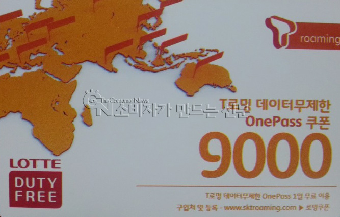 24일 서울 강남구 세곡동에 사는 윤 모(여)씨에 따르면 그는 지난 10월 롯데면세점 코엑스점에서 SK텔레콤의 ‘T로밍 데이터 무제한 원패스(onepass) 쿠폰’을 받았다. 면세점 안내데스크에서 200달러 이상 구매한 고객을 대상으로 나눠주고 있었던 것. 쿠폰에는 ‘T로밍 데이터 무제한 원패스 1일 무료 이용’이라고 적혀 있다.