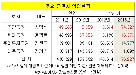 우리투자증권은 올 상반기 148억 원, 대우증권은 17억원의 순이익을 기록한 반면, 동양증권은 1천743억 원 그리고 현대증권은 184억 원의 순손실로 적자를 냈다. 현대증권은 올해 적자전환됐고 동양증권은 적자규모가 심화됐다.