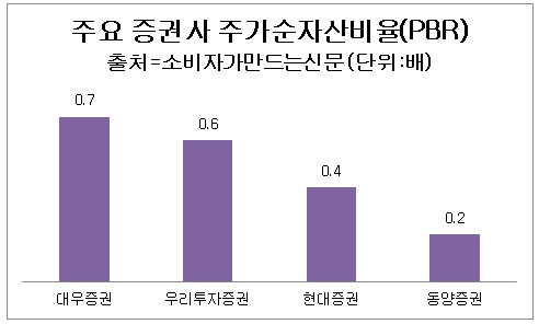 24일 금융투자업계에 따르면 4개 증권사 가운데 주가순자산비율(PBR)이 가장 높은 곳은 0.7배인 대우증권이다. 이어 우리투자증권이 0.6배, 현대증권은 0.4배, 동양증권은 0.2배 순이다.
