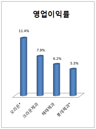 동종업체인 제과 4사와 견줘서도 롯데제과(대표 김용수) 크라운제과(대표 장완수) 해태제과(대표 신정훈)가 각 5.3% 7.9% 6.2%의 영업이익률을 낸 것과 비교, 거의 2배 수준이다.