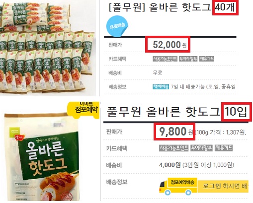 지난해 12월 이마트몰에서 풀무원 ‘올바른 핫도그’ 40개짜리를 5만2천 원에 구입한 강 씨. 대용량 제품이 더 저렴할 거라 생각한 게 잘못이었다.