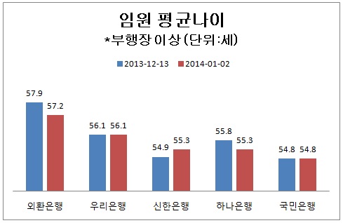 3일 소비자가만드는신문이 외환, 우리, 신한, 하나, 국민 등 국내 주요 은행 5곳의 임원 나이를 조사한 결과 부행장 이상 임원의 평균 나이가 지난해 12월13일 55.9세에서 올해 1월2일 55.7세로 0.2세 젊어진 것으로 나타났다. 이는 지난해 말 5개 은행의 2014년도 정기 임원인사가 반영된 것으로 조사대상은 총 40명에서 39명으로 1명 줄었다.