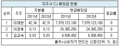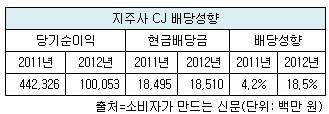 CJ는 2012년 회계 기준 순이익 1천억 원 중 18.5%인 185억 원의 현금 배당을 실시했다..