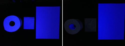휴대용 자외선 램프에 비춰보면 형광증백제 포함 여부를 쉽게 확인할 수 있다.