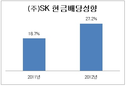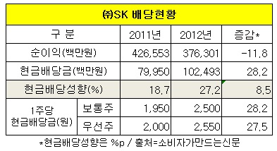 8일 소비자가만드는신문이 지주사인 SK의 배당 현황을 조사한 결과, 최근 2년간 현금배당성향이 18.7%에서 27.2%로 8.5%포인트 상승한 것으로 나타났다. SK의 순이익이 2011년 4천266억 원에서 2012년 3천763억 원으로 11.8% 감소했지만 현금배당금은 약 800억 원에서 1천25억 원으로 되레 28.2% 증가했다.