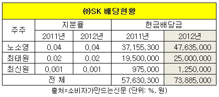 2011년과 2012년 말까지 노소영 관장과 최태원, 최신원 회장은 최근 2년간 보유 주식수에 변동이 없다. 다만 보통주 1주당 현금배당금이 28.2% 오르면서 배당금 규모가 2011년 5천763만 원에서 2012년 7천389만 원으로 늘어났다.
