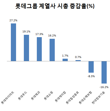 8개 상장사 중 무려 6곳의 시가총액이 늘었으나 금융계열사인 롯데손해보험과 현대정보기술은 뒷걸음질 쳐 대조를 이뤘다.