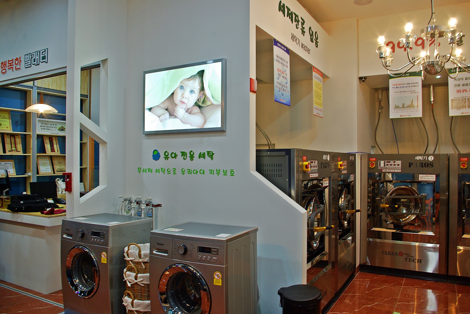 20kg과 25kg, 5대의 무세제 세탁기와 건조기, 소형 유아용 세탁기 2대등 총 7대의 세탁기를 동시 가동할 수있으며 드라이크리닝도 개별 주문할 수있다.