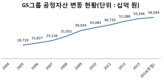 15일 소비자가만드는신문이 2004년부터 2013년까지 최근 10년간 공정거래위원회가 지정한 대기업 그룹의 공정자산 순위를 조사한 결과 GS그룹의 자산 규모는 2005년 18조7천억 원에서 지난해 55조2천억 원으로 불어나 재계 순위 8위에 올랐다. 2005년에 비해 자산 규모가 3배(195.1%)가량 불어났다.