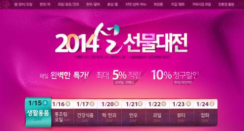 ‘2014 설 선물 대전’은 가격 거품을 뺀 9천900원 이하 상품부터 10만원 이상 고급 선물세트까지 금액대별로 상품을 정리해 선물 선택의 폭을 넓혔다. 9천900원 이하, 1~4만 원, 5~9만 원, 10만 원 이상 등 금액별 인기 상품을 총 90여 종 선별해 가격대별로 과일, 가공식품, 건강식품, 패션 잡화 등을 판매한다.