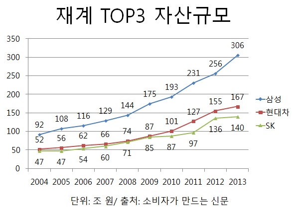 처음 2위 자리에 오른 2005년 1위 삼성그룹과의 공정자산 규모 격차는 30조 원이었지만 지난 해 140조 원으로 약 4.7배 가량 격차가 벌어졌다. 3위 SK그룹과는 26조 원 차이로 바짝 추격받고 있다.