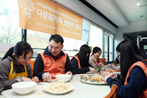 이번 행사에서 미래에셋박현주재단은 2012년 9월부터 ‘희망의 친구들’과 협약을 맺고 교재비를 지원해 온 다문화가정 자녀와 부모를 초청해 설 명절을 맞아 ‘조랭이 떡국’과 베트남 ‘월남쌈’을 함께 만들어 시식하고, 서로에게 새해 덕담이 적힌 희망카드를 전달했다. 특히 미래에셋 임직원들은 주말을 이용해 자녀들와 함께 참여했다.