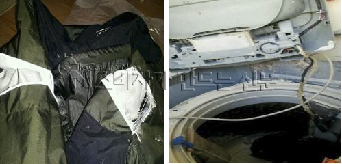 다운롱코트를 손세탁한 후 섬유유연제를 넣고 헹굼과 탈수를 진행하던 중 갑자기 윙~하는 굉음이 들리더니 세탁기 뚜껑이 날아가고 본체가 절단되는 황당한 상황이 벌어졌다. 그 과정에서 다운롱코트 내부 천이 흉하게 찢어졌다.