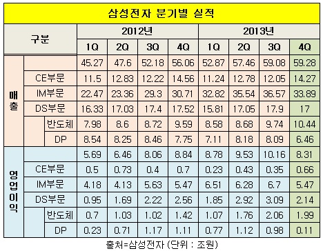 회사 측은 지난해 4분기 실적에 대해 원화강세, 미국의 양적완화 축소 우려 등 불안한 경제 상황에서 일회성 비용인 8천억 원 규모의 '삼성 신경영 20주년 격려금'과 7천억 원 규모의 부정적 환영향을 감안하면 견조한 실적을 유지한 것이라고 평가했다.