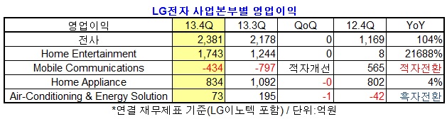 지난해 연간 매출액은 58조 1천404억 원으로 2012년 대비 5% 증가했다. 영업이익은 2012년 대비 6% 성장한 1조 2천847억 원을 기록해 견조한 수익성을 유지했다. HE사업본부는 TV시장 수요 정체로 전년 대비 매출 및 영업이익이 소폭 하락했다.