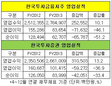 한국투자증권은 작년 4월부터 12월 말까지 영업이익 1천14억 원, 순이익은 840억 원을 기록했다. 이는 2012년 같은 기간동안 영업이익 1천607억 원과 순이익 1천261억 원을 기록했던데서 각각 36.9%, 33.4%나 감소한 수치다.
