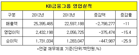 KB금융그룹(회장 임영록)이 지난해 1조2천830억 원의 순이익을 기록했다고 7일 밝혔다. 이는 2012년 1조7천310억 원에서 25.9% 감소한 수치다.