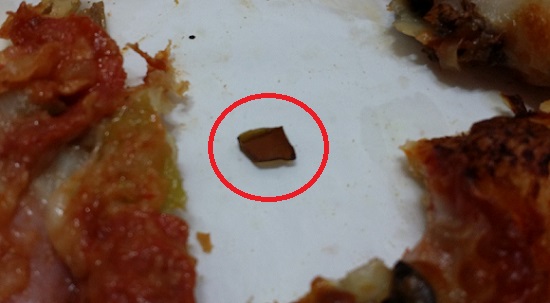 처음 피자 조각를 깨무는 순간 딱딱한 이물감을 느껴 뱉어보니 놀랍게도 깨진 맥주병의 일부로 추정되는 날카로운 조각이었다.