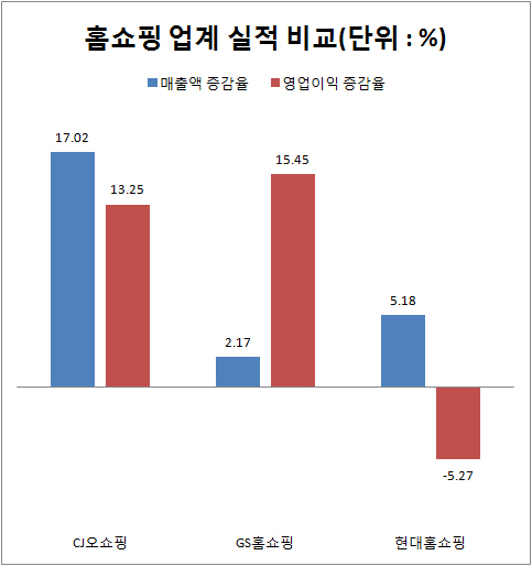경쟁사인 CJ오쇼핑은 지난해 깜짝 실적을 내놨다. 매출 1조2천607억 원으로 전년(1조773억 원) 대비 17.0% 성장했으며 영업이익도 1천572억 원으로 전년(1천388억 원) 대비 13.3%나 늘었다. 매출과 영업익 모두 두자릿수 성장에 성공한 셈이다.