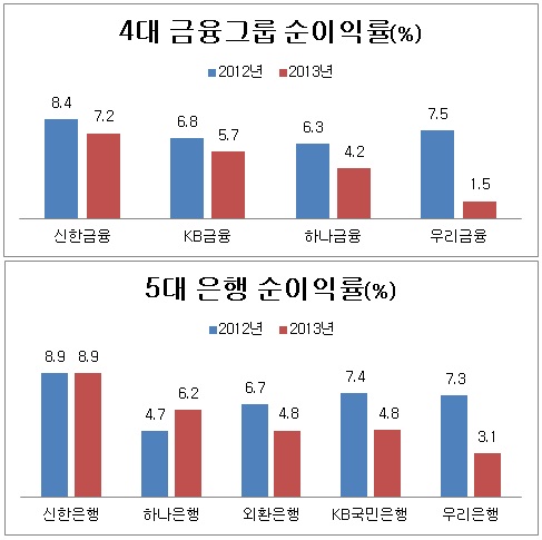 신한은행에 이어 하나은행이 6.2%, 외환은행과 KB국민은행이 4.8%, 우리은행은 3.1% 순으로 순이익률이 높았다. 2012년과 비교했을 때 우리은행이 7.3%에서 3.1%로 크게 하락한 반면, 하나은행은 4.7%에서 6.2%로 되레 상승했다.