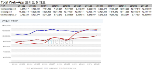이어 쿠팡이 1천214만 명, 티켓몬스터(이하 티몬)이 1천22만 명으로 2~3위를 차지했다.