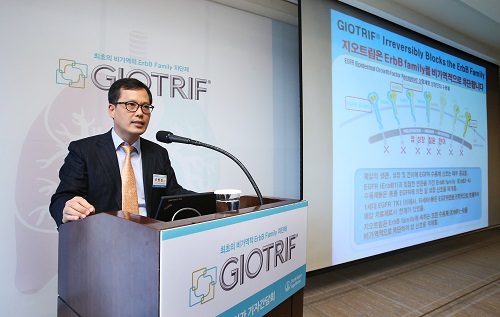 이어 주요 임상연구 결과’에 대해 발표한 연세대학교 세브란스병원 종양내과 조병철 교수는 “대규모 LUX-Lung 3 임상연구 결과를 살펴보면, EGFR 변이를 갖고 있는 환자들을 대상으로 가장 일반적으로 사용되는 화학요법과 지오트립을 비교했을 때 지오트립 투여군은 약 1년(11.1개월)동안 종양이 성장하지 않고 생존하는 고무적인 결과를 보였다”며 “차별화된 특징들을 기반으로 기존 치료제보다 개선된 좋은 치료 경과를 보여주고 있어, 기존 1세대 치료제와는 다른 차세대 표적항암제라고 할 수 있다”고 설명했다.