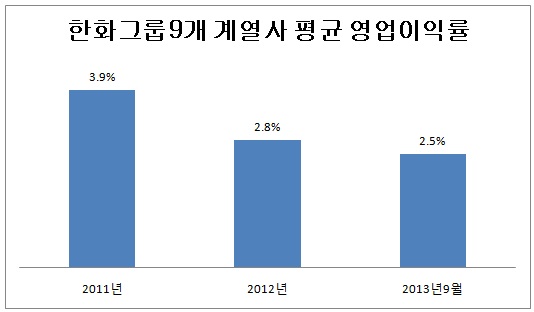 계열사 9곳의 평균 영업이익률은 2011년 3.9%에서 2012년에는 2.8%로 1.1%포인트 낮아졌고 작년 9월에는 2.5%로 점차 하락하는 추세다.