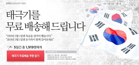 지경민 옥션 온사이트마케팅 부장은 “국제 스포츠행사가 많은 올해 삼일절을 기점으로 태극기 보급을 확산하고자 태극기 무료배송 행사를 준비했다”며 “동계올림픽에서 한국 선수들이 선전을 펼치면서 삼일절의 의미를 되새길 수 있는 좋은 계기가 될 것으로 기대한다”고 말했다.