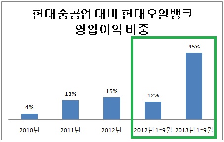 그러나 2011년 영업이익 비중은 13%로 올랐고, 2012년 15%, 지난해 9월에는 45%로 확대됐다. 전체 영업이익이 크게 줄어들면서 현대오일뱅크의 실적 기여도가 커진 것이다.