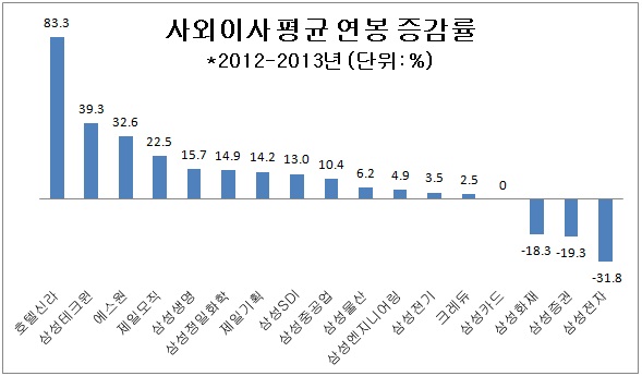 제일모직도 7천20만 원에서 8천600만 원으로 22.5% 증가했고, 삼성생명과 삼성정밀화학 제일기획 삼성SDI 삼성중공업 등 5개사도 10% 이상 연봉이 늘어났다.