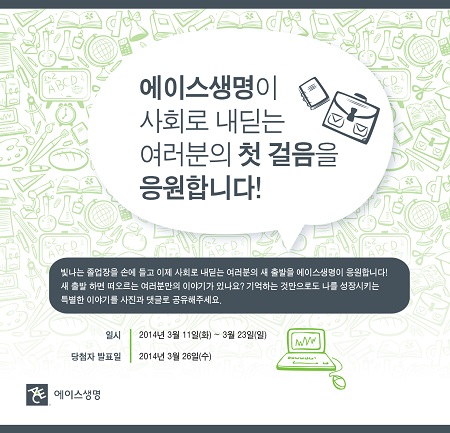 에이스생명 공식 페이스북 담벼락에 ‘새 출발’과 관련된 자신만의 사연을 사진과 함께 게시하거나 또는 간단하게 댓글로 사연을 남기는 방식으로 이벤트에 참여 가능하다. 사연과 사진을 페이스북에 올린 후 에이스생명 페이스북에‘좋아요’를 누르면 이벤트 참여가 완료된다.