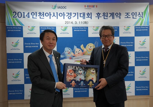 최양하 한샘 회장과 2014인천아시아경기대회조직위 권경상 사무총장은 오늘 인천 미추홀타워에서 공식후원 계약을 체결했다.