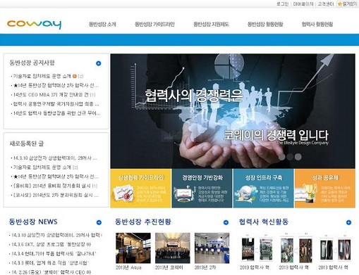 코웨이 상생포털은 협력사와의 소통을 강화할 목적으로 만들어졌으며 동반성장 소개, 동반성장 가이드라인, 동반성장 지원제도, 동반성장 활동현황 및 협력사 활동현황 등의 코너로 구성되어 있다고 소개했다.