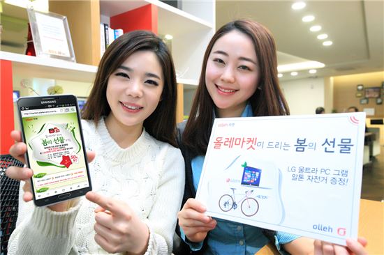 KT(회장 황창규)는 자사 앱스토어인 올레마켓에서 유료앱 및 콘텐츠를 구매하면 추첨을 통해 노트북, 자전거 및 스무디를 증정하는 ‘올레마켓 봄맞이 특별 이벤트’를 다음달 13일까지 진행한다고 18일 밝혔다.