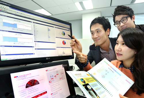 ▲ LG유플러스 직원들이 네트워크접근제어(NAC) 솔루션을 적용한 IP관리자 페이지를 조회하고 있는 모습.