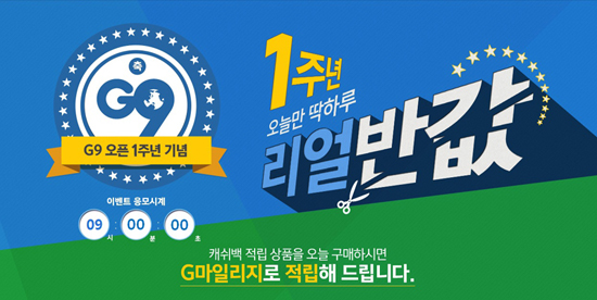G9는 31일 오전 9시부터 오후 6시까지 매 시간마다 새로운 상품 3개씩 선보이고 마일리지 적립 혜택을 제공한다. 평균적으로 구매 금액의 50%가 마일리지로 적립되고 일부 상품의 경우 구매 가격 전액을 마일리지로 돌려준다. 1만 마일리지 이상이면 현금잔고로 전환해 G마켓과 G9에서 현금처럼 쓸 수 있다.