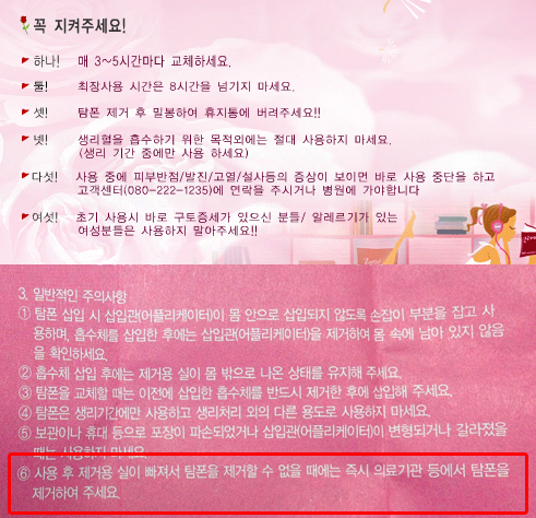 한편 체내 삽입형 생리대 '템포'를 생산하는 동아제약 측은 내부 사용 설명서 일반적인 주의사항에 '사용 후 제거용 실이 빠져서 제거할 수 없을 때에는 즉시 의료기관 등에서 탐폰을 제거하여 주세요'라는 문구를 넣고 있는 것으로 나타났다.