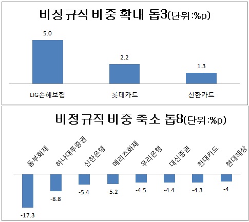 또 미래에셋증권(대표 조웅기·변재상)이 1.8%, KB국민카드(대표 김덕수) 2.2%, 현대해상(대표 이철영) 2.3%, 한화생명(대표 이철영) 2.7%, 동부화재(대표 김정남) 2.8% 등의 순으로 비정규직 비중이 낮았다.