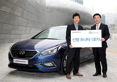 현대차는 지난 4일 동대문디자인플라자에서 강민호 씨와 곽진 현대차 국내영업본부장(부사장)등이 참가한 가운데 신형 쏘나타 1호차 전달식을 가졌다.
