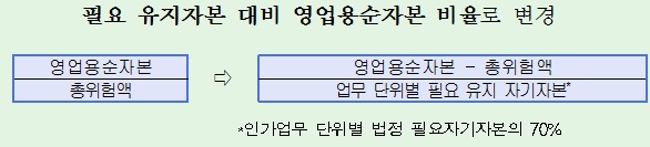 이밖에도 기업에 대한 대출이 영업용순자본에서 전액 차감돼 NCR이 급락할 경우 투자은행(IB)업무가 활성화되기 곤란했던 문제점을, 영업용순자본에서 차감하는 대신 신용위험으로 반영토록 개선할 방침이다.
