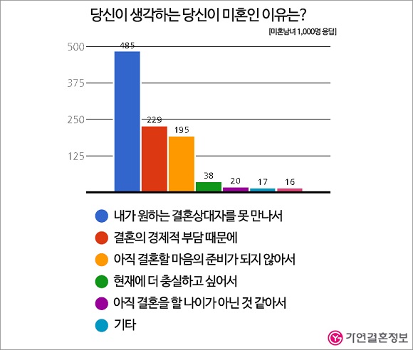 현재 미혼인 이유에 대해서는 응답자의 48.5%가 ‘내가 원하는 결혼 상대자를 못 만나서’라고 답변했고 ‘결혼의 경제적 부담 때문에’(22.9%) ‘아직 결혼할 마음의 준비가 되지 않아서’(19.5%) 등의 순서로 나타났다.